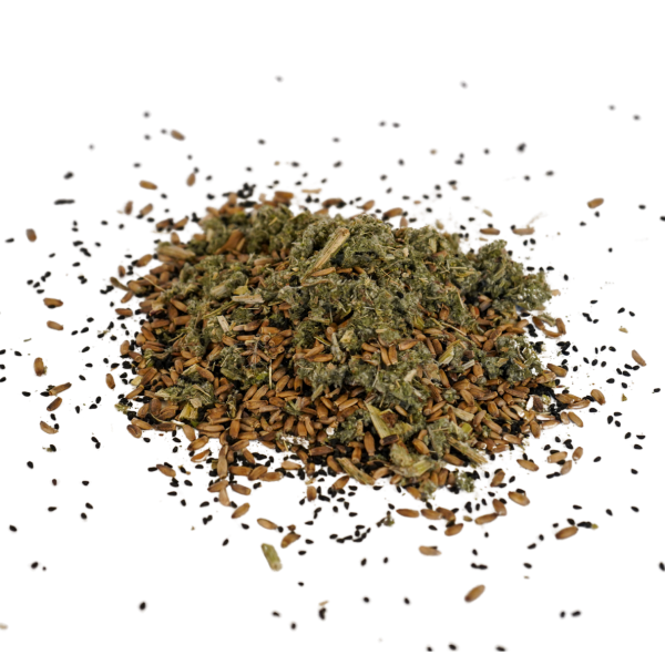 Trocken oder aufgebrüht mit dem Sud unter das Futter mischen.